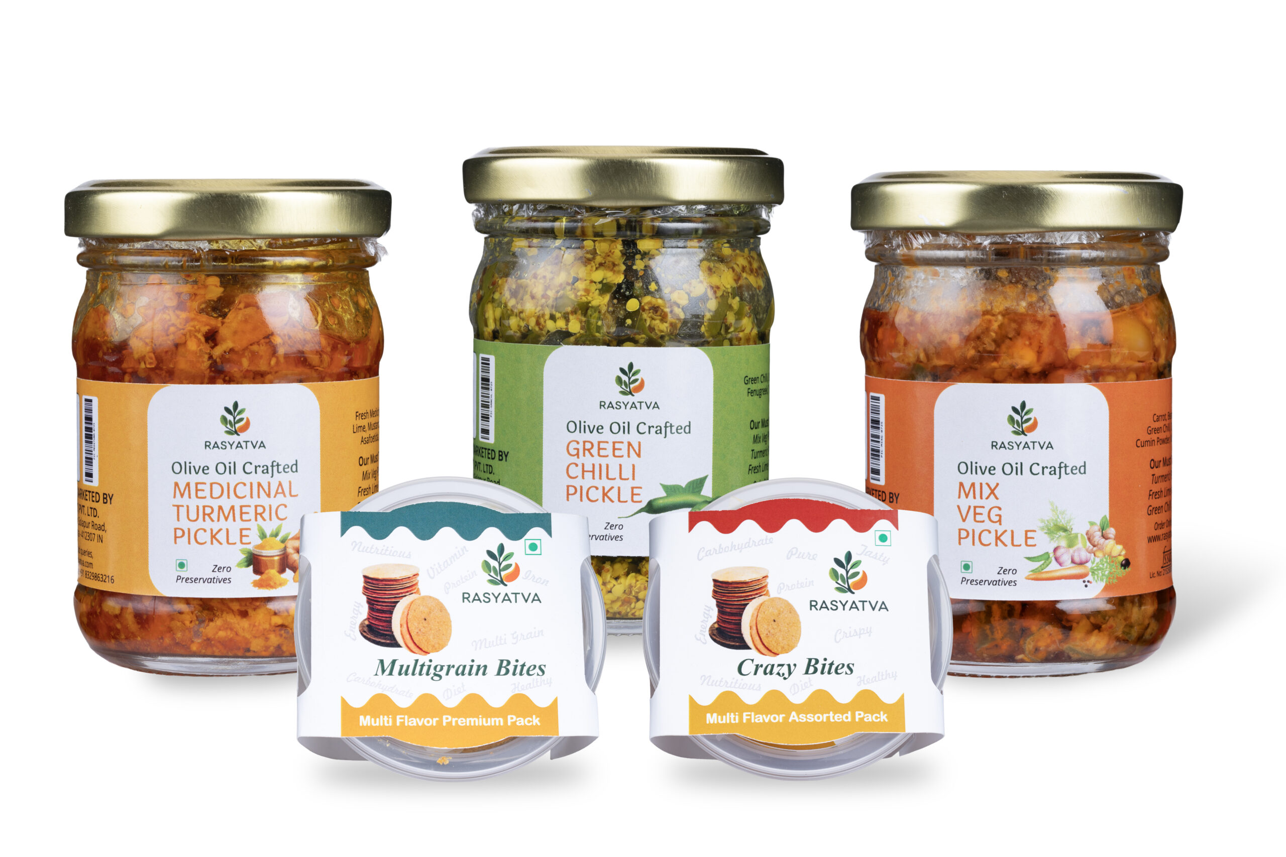 Green Chill Pickle + Medicinal Turmeric Pickle + Mix Veg Pickle + Crazy Bites + Multigrain Bites